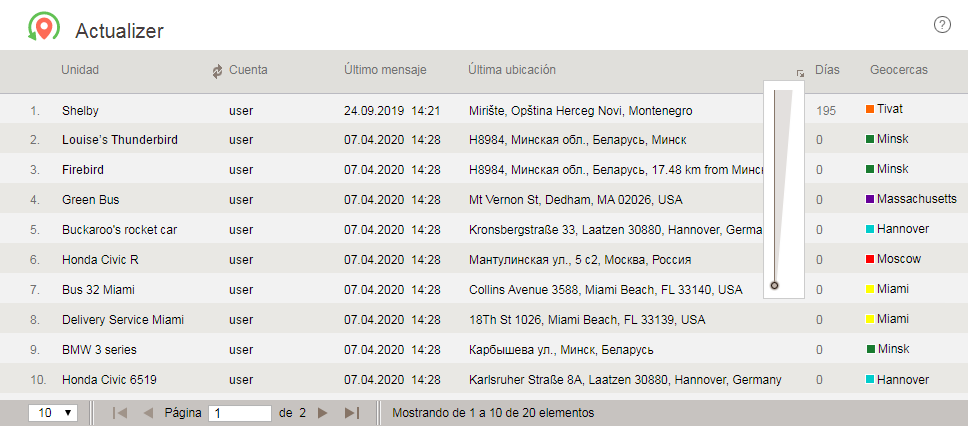 Los datos de la tabla pueden ser ordenados alfabéticamente o según la actualidad de mensajes recibidos. También se puede ajustar filtración por días, es decir, indicar por medio del deslizador la cantidad mínima de días durante la cual no se han recibido mensajes de unidad.