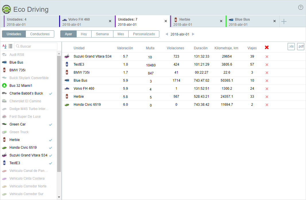 Esta opción permite exportar los datos de una unidad o un grupo de unidades a un archivo. Se soportan dos formatos: XLS (Excel) y PDF. Para exportar los datos de un grupo de unidades, apriete el botón
