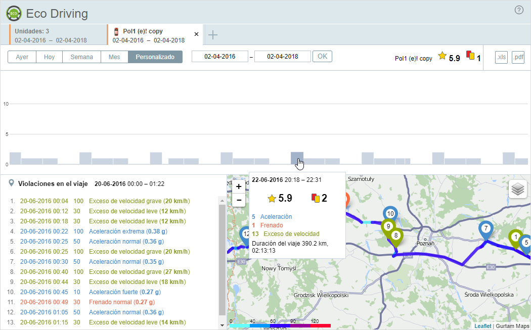 A la izquierda del mapa está la lista de infracciones registradas durante este viaje. La lista tiene también aspecto tabular e incluye los siguientes datos: la fecha del viaje, su duración, el tipo de infracción y la cantidad de puntos cargados por la misma, así como su valor digital. La línea con la infracción se selecciona en la lista al hacerse clic en el marcador de esta infracción en el mapa.