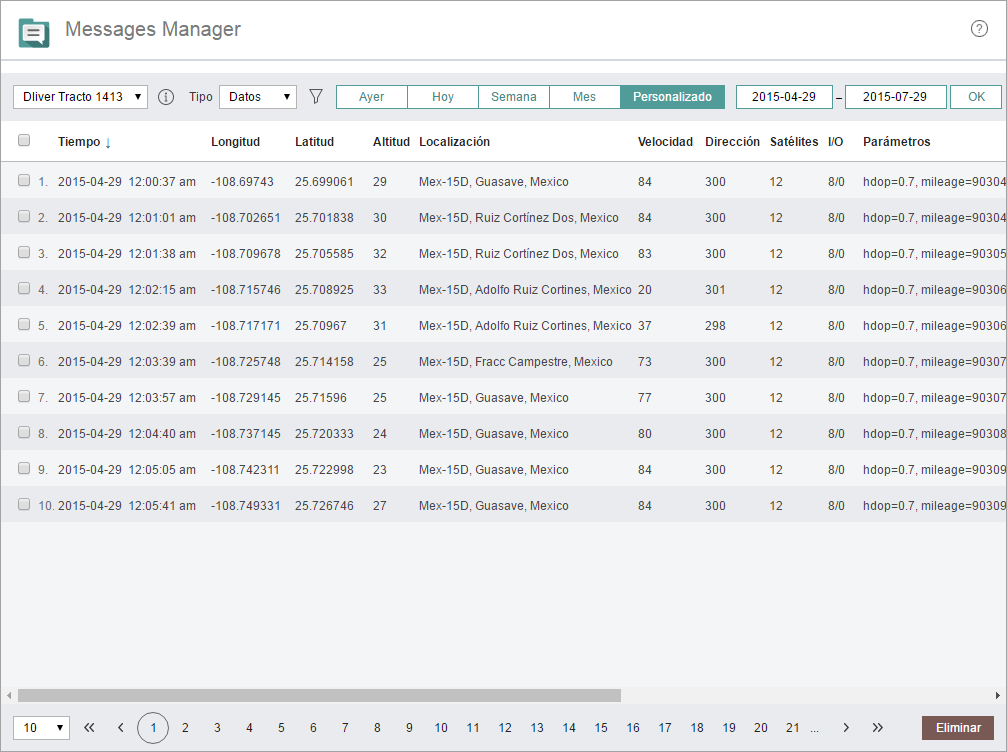 Una vez abierta la aplicación, se muestra el panel superior que sirve para formar una solicitud. En este panel hay que indicar tales parámetros como el nombre de la unidad, el tipo del mensaje, el filtro (si es necesario) y escoger el intervalo temporal por el cual quiere usted obtener mensajes. Hay dos tipos de intervalos disponibles: predeterminado (Ayer, Hoy, Semana, Mes) y ajustado (Personalizado), para el cual se puede ajustar cualesquiera fechas. Por medio de las flechas Atrás/Adelante un intervalo predeterminado se modifica por un día, semana o mes, respectivamente. Una vez ajustados los parámetros necesarios, en la parte central de la interfaz aparece la información correspondiente en forma de una tabla. Se puede ordenarla por tiempo, velocidad, cantidad de satélites. Para hacerlo, haga clic en el parámetro necesario en el encabezamiento de la tabla.