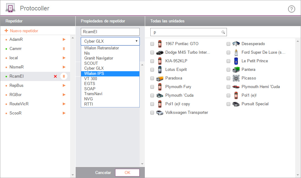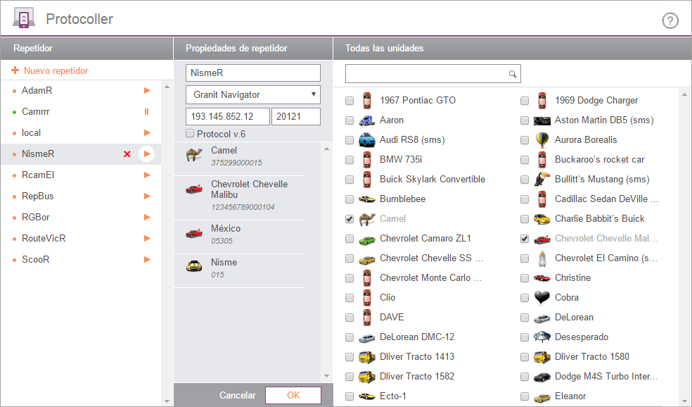 Para crear un repetidor hay que apretar el botón Nuevo repetidor, escoger las unidades e indicar otras propiedades del repetidor: nombre, protocolo de retransmisión, servidor, puerto, etc. Una vez llenado el panel de propiedades apriete OK.
