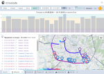 После того как был произведен расчет и получена оценка качества вождения, есть возможность перейти к более расширенному разбору оценки, кликнув на строку объекта в таблице статистики. После клика можно наблюдать следующий интерфейс: в верхней части экрана появятся поездки, ниже — карта, слева от карт — таблица нарушений.