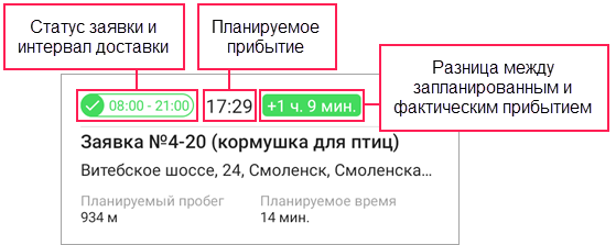 После указания статуса у заявок также показывается время опережения или отставания, то есть на сколько фактическое время прибытия отличается от запланированного.