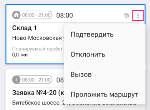в правом верхнем углу карточки открывается меню, с помощью которого курьер может указать статус заявки (нажать Подтвердить или Отклонить) и связаться с клиентом (нажать Вызов). Также статус заявки можно указать из окна подробной информации о заявке.