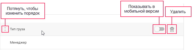 Чтобы произвольное поле показывалось в заявках в мобильном приложении, наведите курсор на строку с полем и активируйте переключатель.